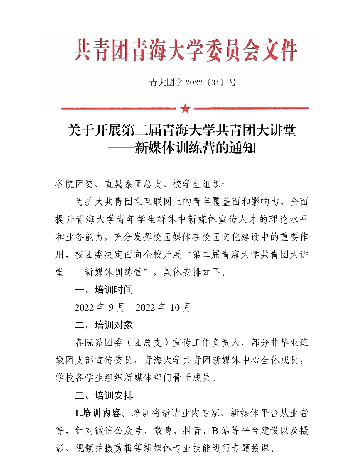 关于开展第二届浪live 共青团大讲堂 ——新媒体训练营的通知