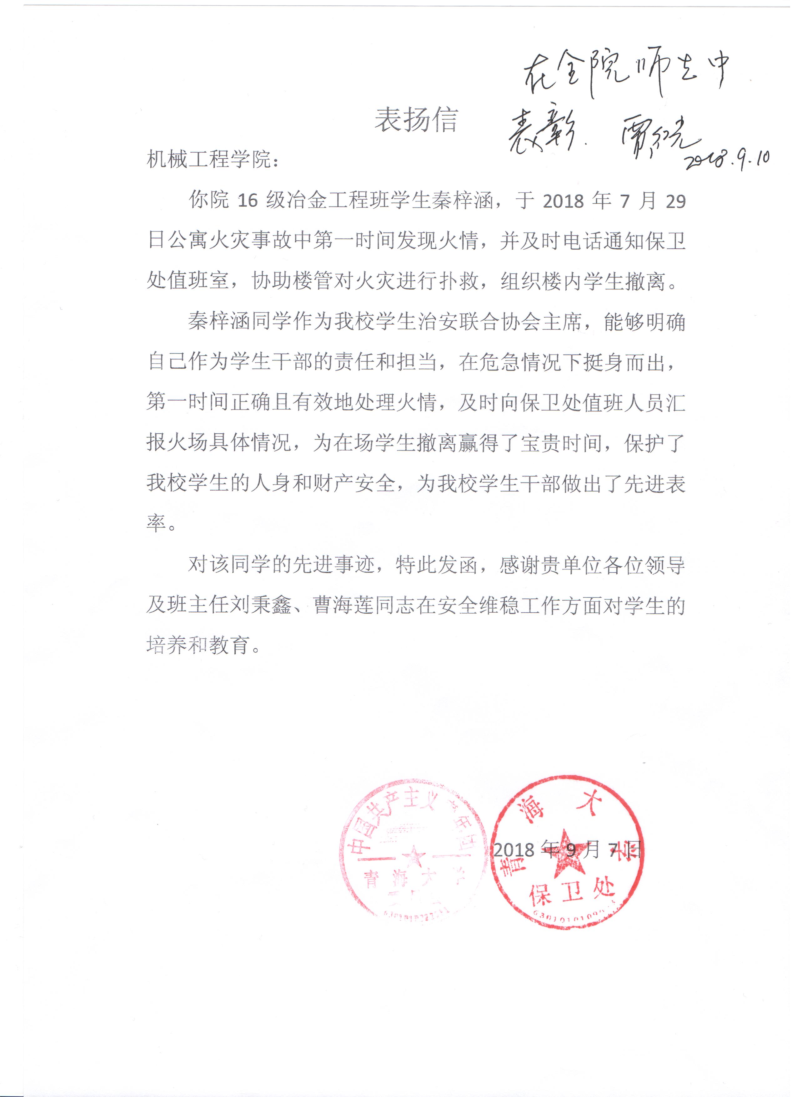 对2016级冶金工程班学生秦梓涵的表扬信