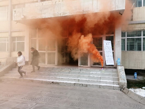通过前期的宣传,使得同学们对消防安全自救逃生知识有了一定的了解,并提前一周对演练活动进行入宿舍告知,避免恐慌。本次消防安全应急疏散演练于11月9日下午16时30分开始,特邀嘉宾西宁市政安消防中心王教官拉响警报器,伴随着消防演练弹的滚滚浓烟升起,所有人员在“消防指挥员”的指挥下紧张而有序的从14号公寓撤离至集结点。